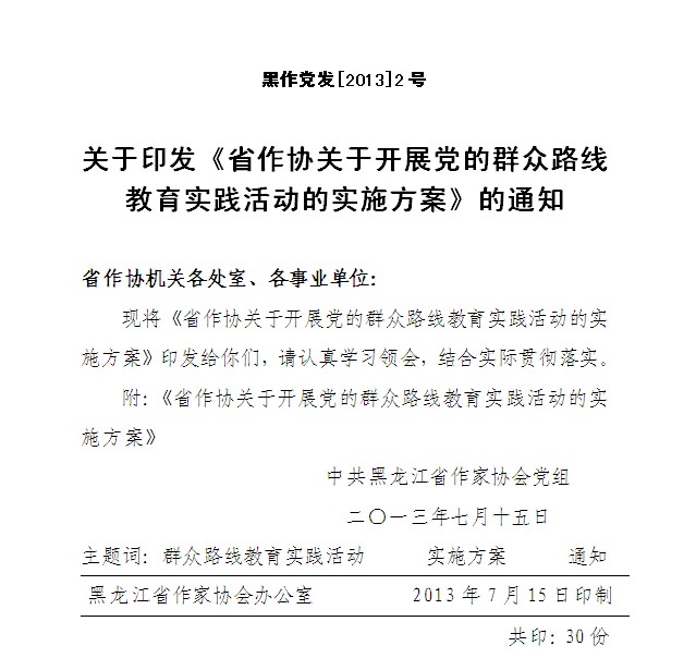 按照《中共中央关于在全党深入开展党的群众路线教育实践活动的意见》、《中共黑龙江省委关于深入开展党的群众路线教育实践活动的实施意见》和《中共黑龙江省委关于第一批开展党的群众路线教育实践活动的实施方案》的部署,结合省作协实际,制定实施方案如下。