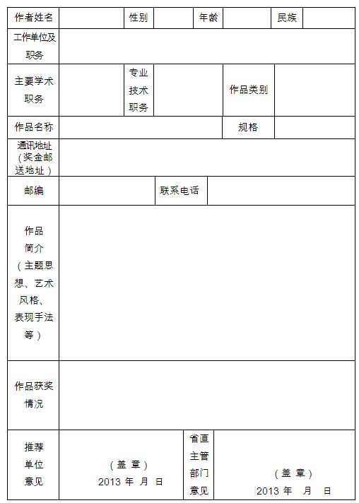 注:此表由申报者填写。推荐单位指:各市(地、系统)党委宣传部或省直文艺创作生产研究单位或省级各文学艺术专业协会、高校党委宣传部。