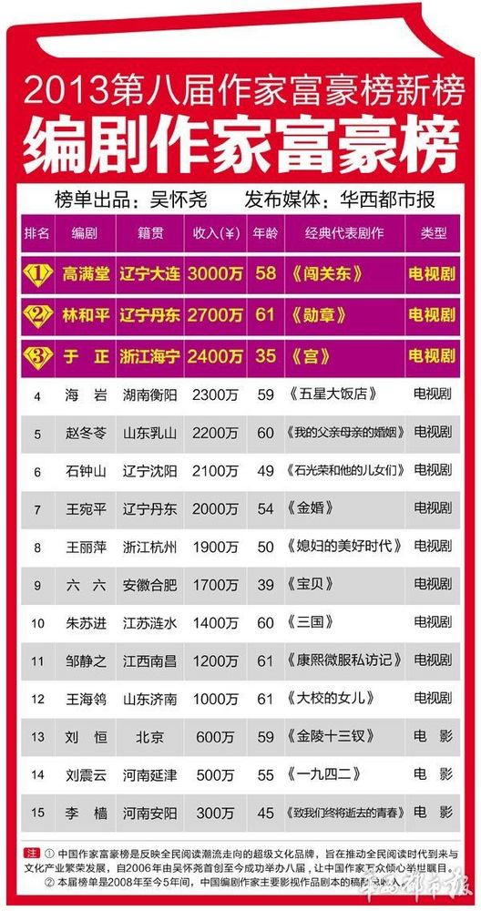 12月3日,“中国编剧作家富豪榜”公布,著名编剧高满堂、林和平、于正分别以3000万、2700万、2400万的编剧稿酬收入荣登前三甲。榜单的公布唤起外界对编剧这一相对“冷门”群体的关注。以2100万稿酬位列第六名的石钟山在接受中新网记者采访时直言:“这个数字不精确,只是一个估算值。编剧的收入在业内来说极为寒酸,在制作环境中堪称弱势群体。”