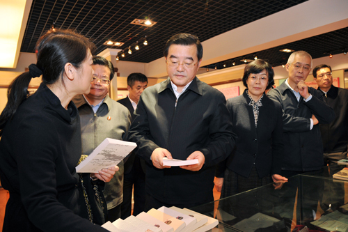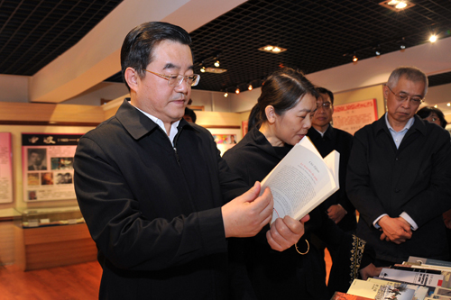 张庆伟在黑龙江文学馆调研,观看展览、听取介绍。