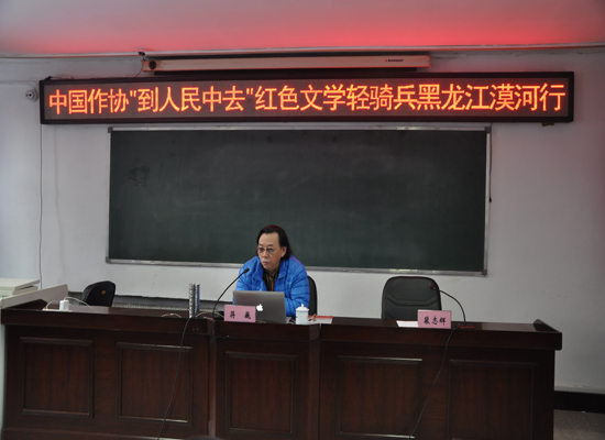 为贯彻落实习近平总书记给内蒙古自治区苏尼特右旗乌兰牧骑回信的重要指示精神,按照中宣部《关于学习贯彻习近平总书记重要指示精神做新时代“红色文艺轻骑兵”的通知》要求,进一步丰富城乡群众的精神文化生活,1月23日,由中国作协主办,黑龙江省作协、大兴安岭地委宣传部协办的“到人民中去”红色文学轻骑兵黑龙江漠河行文学公益讲座活动在漠河举行。