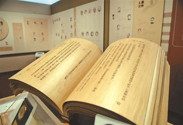 除了平面展墙的讲解,展厅内玻璃展柜和实木书架内放置的一件件手稿和文学奖证书,更是以实物的珍贵惊艳到了参观者。放眼望去,一本展开的木刻书籍雕刻作品特别吸睛;木雕之下的玻璃展柜里,摆放着黑龙江省作家获得的全国文学大奖的证书原件和作品手稿。三组硕大的实木展柜,全景展示了黑龙江省现当代68位著名作家的书影、书籍和头像。每位作家头像旁边,是一个玻璃门展柜,里边放着其代表作,旁边一排小抽屉则暗藏玄机——轻轻拉开,原来里边珍藏的是作家的珍贵手迹,或书稿,或信件……如此精妙的展陈方式,是文学馆用心带给观众的诚意之作。
