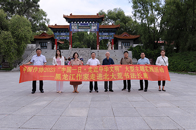 7月7日,中国作家协会会员、鸡西市作家协会主席邹本忠参加2023“中国一日·走近中华文明”大型文学主题实践活动,走进书法碑林——北大荒书法长廊进行实地采访,与中共密山市委宣传部副部长金纪霞,北大荒书法长廊的策划、建设者胡春东、徐金柱, 密山市文化馆副馆长孙云阁等有关同志畅谈,了解书法长廊对密山经济社会发展发挥的作用,并通过和创意者、设计者、建设者和组织者进行深入交流,感悟中华文明书法艺术传承和发扬的脉络,思考在北大荒的边陲城市,一座大型书法碑林拔地而起的文化奥秘,创作了文学作品《镌刻在北大荒土地上的翰墨诗章》。