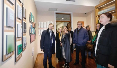 黑龙江省作协党组书记陈文远与《我们的同时代人》主编、俄中共鸣项目主要负责人谢达梅托娃互赠文学作品并致辞。陈文远表示,中俄文化交流源远流长,黑龙江文学馆的展陈凝聚着两国文学交流的成果,期待未来有更多中国文学作品被译介至俄罗斯,进一步促进文明互鉴。谢达梅托娃介绍了于今年5月推出的《我们的同时代人》俄中双语特刊,其中收录了包括黑龙江作家阿成等在内的16位中国作家的作品,展现了中俄文学交融的新成果。