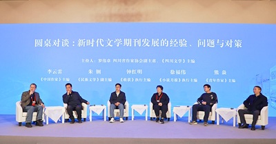 圆桌对话环节由四川省作家协会副主席、《四川文学》主编罗伟章主持,《中国作家》主编李云雷、《民族文学》副主编朱钢、《收获》执行主编钟红明、《小说月报》执行主编徐福伟、《青年作家》主编熊焱围绕“新时代文学期刊发展的经验、问题与对策”进行深入对话讨论。
