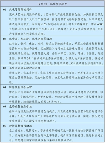 持续深入推进污染防治攻坚,以更高标准改善大气、水、土壤环境质量。以京津冀及周边、长三角、汾渭平原等重点区域为主战场,强化细颗粒物(PM2.5)控制,深入推进重点行业超低排放改造,推动挥发性有机物源头替代和全流程治理,制定下一阶段机动车排放和油品质量标准,深化大气环境绩效分级管理,氮氧化物、挥发性有机物排放量分别下降8%以上,进一步消除重污染天气。加强长江中游、成渝等区域大气污染防治。加强餐饮油烟、恶臭异味和环境噪声污染治理。统筹水资源、水环境、水生态治理,以解决全流域和跨省界突出问题为重点,加强重要江河湖库系统治理和生态保护,基本完成重点流域海域入河入海排污口排查整治,化学需氧量、总磷排放量分别下降6%,巩固城市黑臭水体治理成效、基本消除县乡黑臭水体。加强土壤污染源头防控,推进受污染耕地、建设用地安全利用。